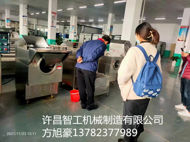11月22日,湖北客户一行2人来到许昌智工机械制造有限公司试机小型电磁炒货机炒制栗子。