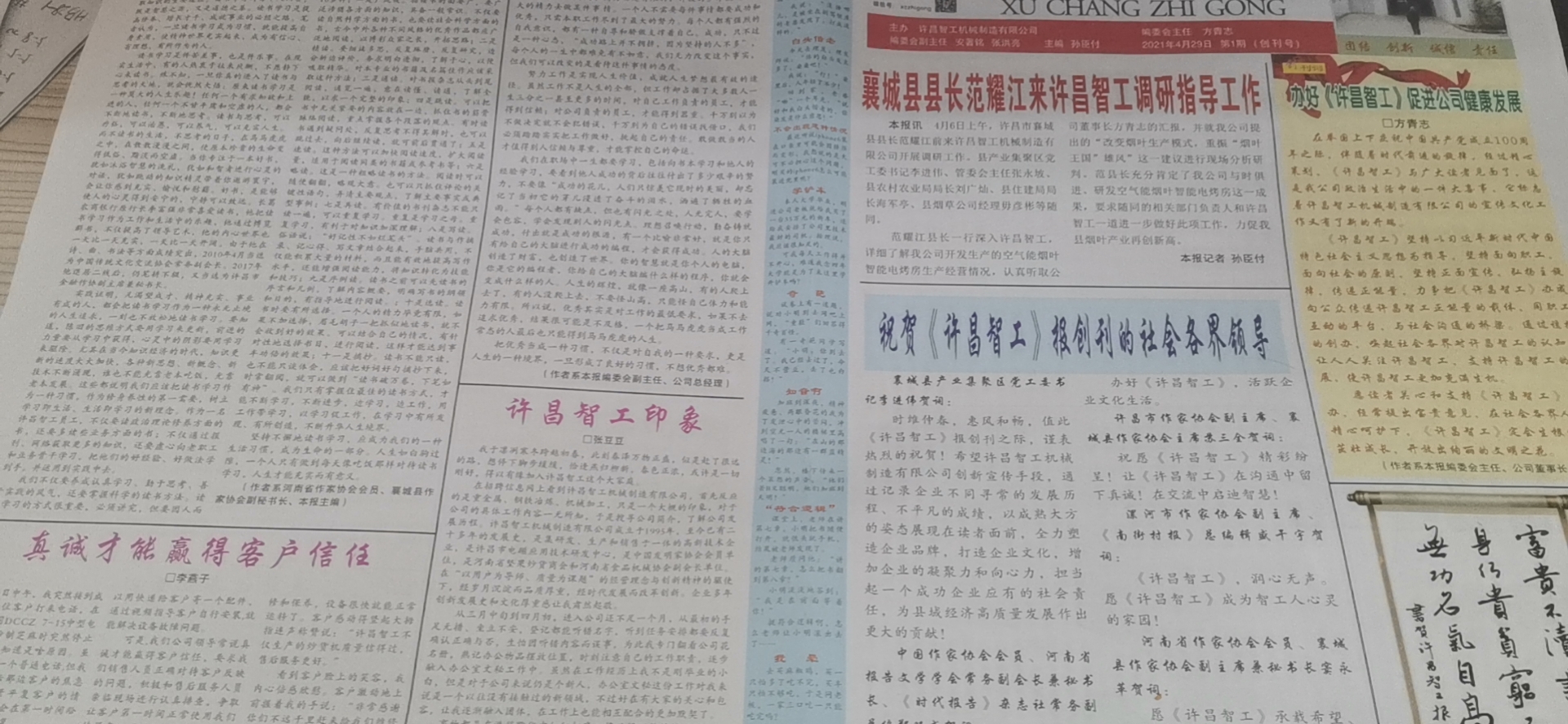 往大方面来说,文化是一个国家和民族的灵魂,一个有历史的国家,有文化传承的国家,是非常有凝聚力和创造力的!同样对于一个企业来说,文化同样是这个企业的灵魂,是一个企业不断创新发展的内在动力。许昌智工文化报于2021年4月29日成功创刊!!!